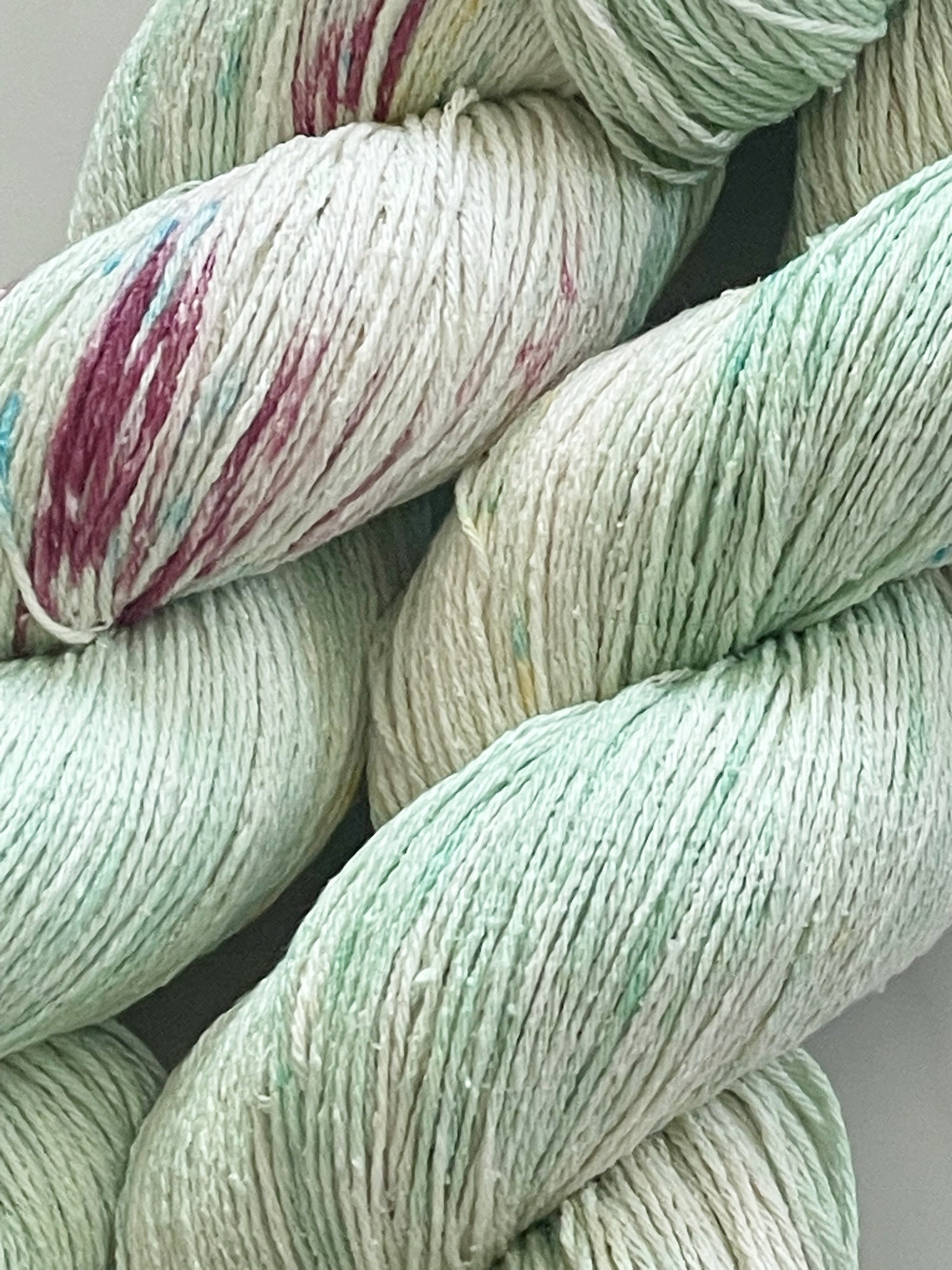 Rustic Silkは絹100%の紬糸です。ツルっとしていて光沢感のある正絹ではなく、カジュアルにお使いいただける、節のあるざっくりとしたマットなテクスチャーです。春夏のウェアや小物に特にお勧めですが、絹は冬暖かく夏涼しいという長所がございますので、春~秋の3シーズン、または重ね着でしたら冬にも年間を通してご着用いただけます。コットンより軽いのも嬉しいポイントです。